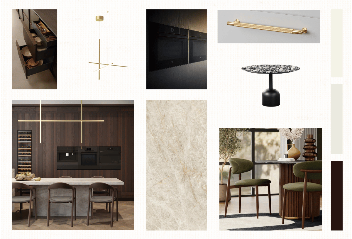 Ce moodboard dessine un intérieur contemporain, chaleureux et sophistiqué, pensé comme un ensemble cohérent. La palette est douce et lumineuse (crème, sable, greige), structurée par des bois bruns profonds, des touches de vert dense et des détails en laiton. Les matières nobles comme le marbre, le bois texturé, métal, tissus, qui apportent du relief sans jamais alourdir l’espace. Les lignes sont nettes, mais toujours adoucies par des courbes et des volumes enveloppants, avec une attention particulière portée à la lumière et aux finitions. L’atmosphère est calme, élégante, presque “hôtelière”, avec cette sensation de confort discret et de qualité évidente, qui traverse toutes les pièces et donne au lieu une vraie présence.