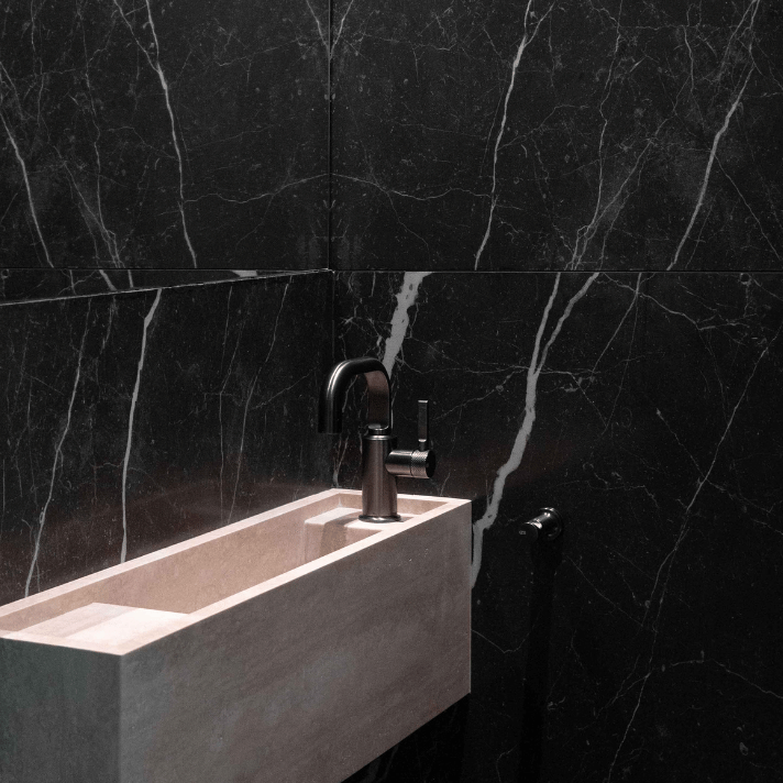 La salle de bain joue le contraste entre minéral et profondeur : Taj Mahal lumineux, pierre sombre veinée et bois brun. La robinetterie laiton apporte une touche précieuse, équilibrée par des détails noirs graphiques. Lignes épurées, finitions nettes, lumière douce : une ambiance spa, élégante et intemporelle.